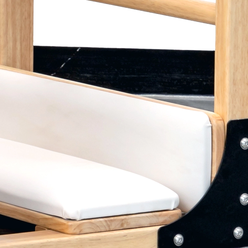 The Durable Pilates Studios Oak Ladder Barrel is finished in a heavy-duty PU (Polyurethane) leather. Unlike genuine leather, which absorbs sweat and bacteria, our PU finish is hydrophobic and antimicrobial. It withstands the harsh disinfectants used daily in commercial gyms without peeling or fading. The stitching is reinforced with bonded nylon thread to prevent seam rupture under tension.