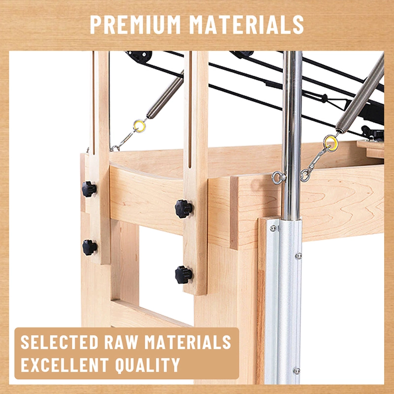 The durability of a Pilates Cadillac is tested at its connection points. Unlike domestic models that may use lightweight alloys or softwoods, our Durable Wooden Pilates Cadillac utilizes a reinforced solid wood chassis. This heavy-duty base provides the necessary mass to prevent “sliding” or “tipping” when clients perform dynamic exercises on the trapeze or push-through bar.