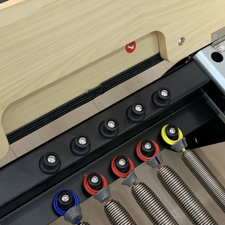 Diseñamos el sistema de deslizamiento de este reformador de Pilates de aluminio para que sea extremadamente silencioso y suave. Gracias a sus rieles mecanizados con precisión y ruedas de poliuretano personalizadas, el carro se mueve con fluidez, independientemente del peso del usuario o de la tensión del resorte.