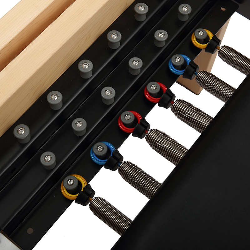 - Reformer Springs: Klassísk 5-gorma raðgerð (venjulega 1 rauð/þung, 2 blá/miðlungs, 2 gul/létt) gerir kleift að stilla mótstöðuna nákvæmlega. Gírstöngin er stillanleg, sem gerir leiðbeinendum kleift að breyta forspennu gormanna til að laga sig að mismunandi fótleggjalengdum án þess að skerða líftíma gormanna.