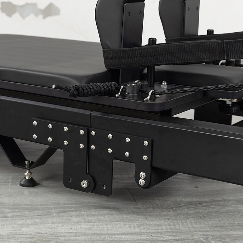 The folding mechanism is engineered for simplicity and safety. Unlike budget-grade folding home equipment, this machine features a reinforced hinge system and heavy-duty locking pins. When unfolded, the rails align perfectly to ensure a seamless carriage glide—a feat that many Pilates Training Machine manufacturers struggle to achieve. This precision engineering ensures that the user never feels the “seam” of the fold, maintaining the fluid motion essential for the Pilates method.